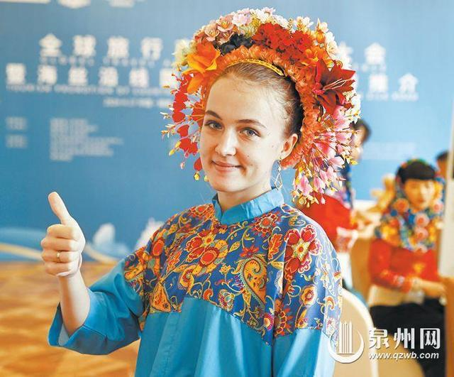 “簪花围”火爆出圈,图为俄罗斯短视频博主金玉梅体验“簪花围”。(融媒体记者庄丽祥 摄)