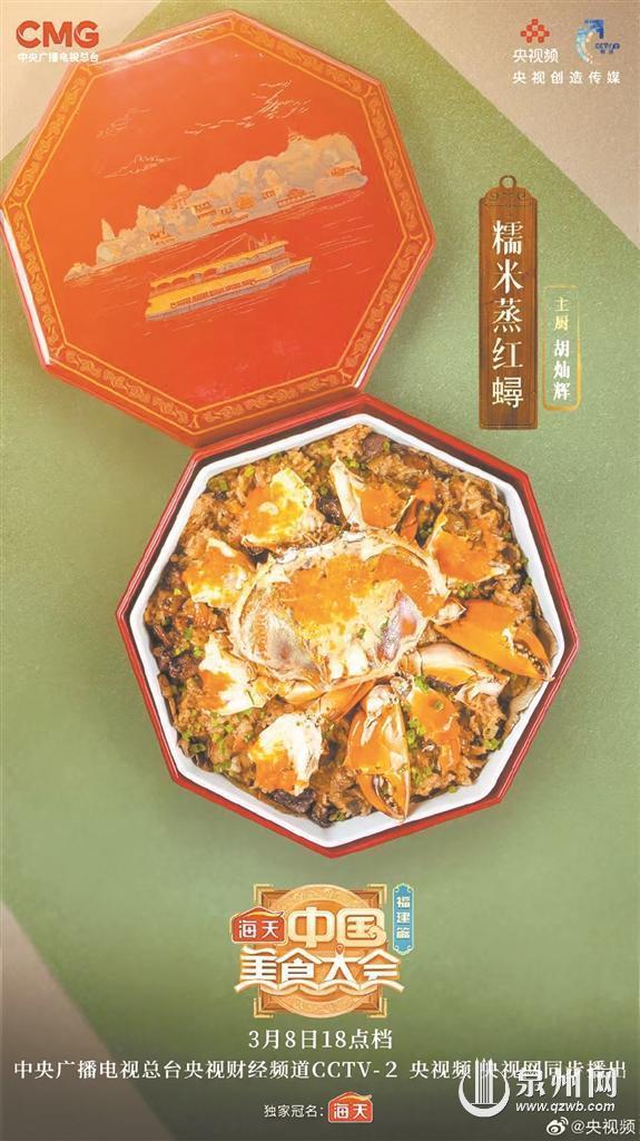 美食制作者胡灿辉带来了泉州传统美食糯米蒸红蟳。红蟳的鲜美与糯米的谷物清香完美交融,这道佳肴赢得了美食作家欧阳应霁的高度赞誉。