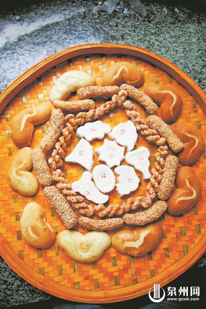“食同味”,食俗自然也多有相同。在泉台两地,有些茶余饭后的糕点,还是节庆、祭祀时不可或缺的食物。据清末台湾人连横所著的《雅言》记载,“遇喜庆事,以红粬和米粉或面,范如龟形,炊熟相贻,即以‘龟’称……年节祭祀之时,每制红龟,以馈戚友……”书中提到的“米龟”,“雕木为龟形,以糯米之粞印之,裹糖及豆沙、麻仁之类”。泉州的“龟粿”同样有福、禄、寿的象征,其中最负盛名的要数已有200多年历史的永春“榜舍龟”。“榜舍龟”的外皮调入红糖,颜色煞是喜庆,内馅采用上好绿豆做成的豆沙,口感清爽。