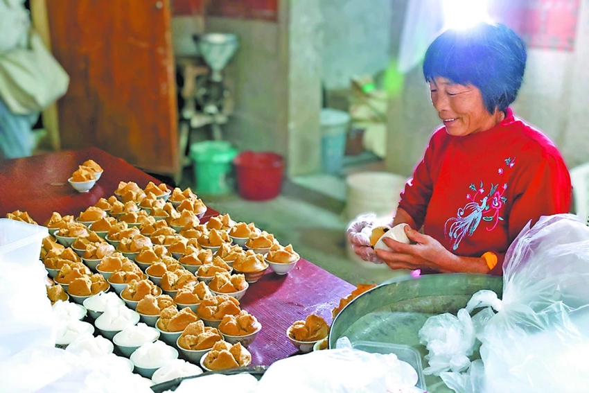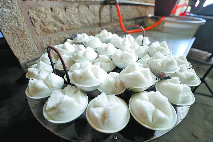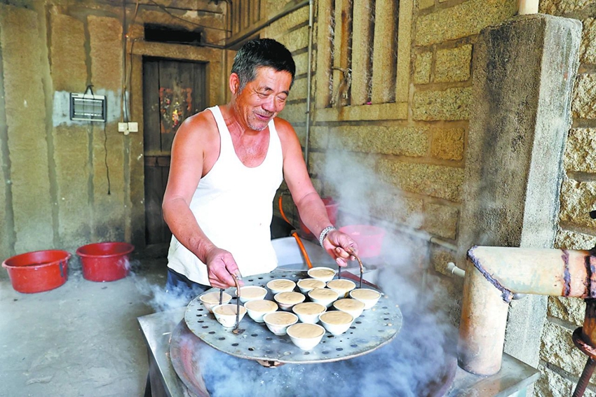 11月7日上午9时许,在晋江安海镇坝头村,一座古色古香的闽南红砖古厝旁,袅袅炊烟升起,63岁的手艺人王恭图正在蒸制碗糕。灶炉下,柴火烧得正旺,大铁锅水蒸气吱吱冒响,阵阵米香传来。不多时,碗糕出炉,表面洁白“开口笑”,微微甜香诱人生津。“坚持传统手艺,把握米浆发酵和火候,烧柴火,用瓷碗,这是老一辈人传下来的古早味。”王恭图说,20世纪80年代,村里有100多户人做碗糕,现在只剩10多户,他不能用电蒸制,因为那样碗糕的色香味形都差得多。很多在外的乡亲回来,就喜欢这种古早味碗糕,那是家乡记忆。