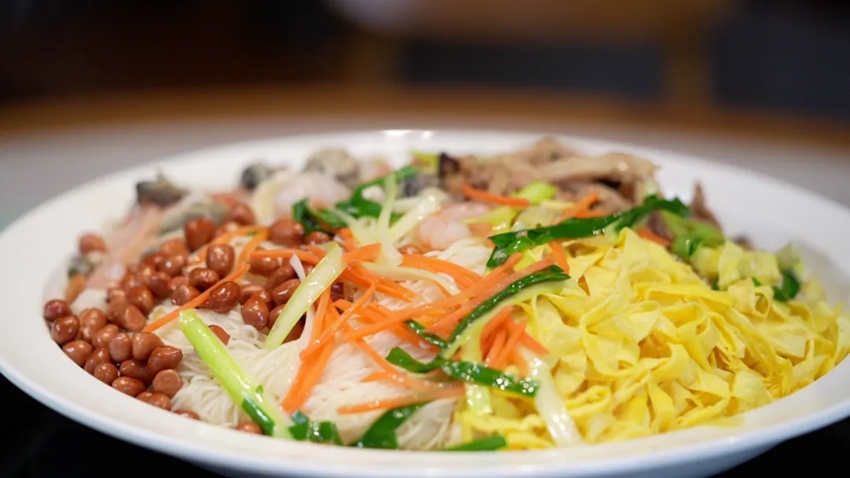捞面线、煎切鸡蛋、炸花生炒料、拌油、摆盘,一根面线便可串起晋江人的一生,出生满月、每年生辰、结婚盘担、做寿……在晋江华侨回乡接风洗尘,也需要准备面线,俗称“脱草鞋”。面线被赋予了长寿、吉祥的美好寓意,面线长寓意寿命长,同时也是希望日子过得绵绵长长。