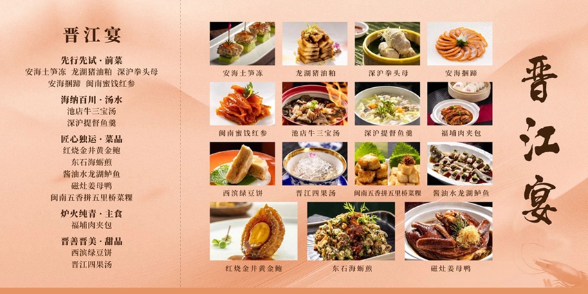 本次正式发布的首批“晋江宴”菜单共有33道菜品,分为前菜、汤羹、主菜、主食、甜品五大类,囊括晋江十三个地区特色物产和烹饪技法,以“大菜+小吃”的模式,在保证菜品本味的基础上,为食客提供更本土化,更多样化的菜品选择,在适应更多人群需要的基础上,为食客提供更优质的用餐体验。