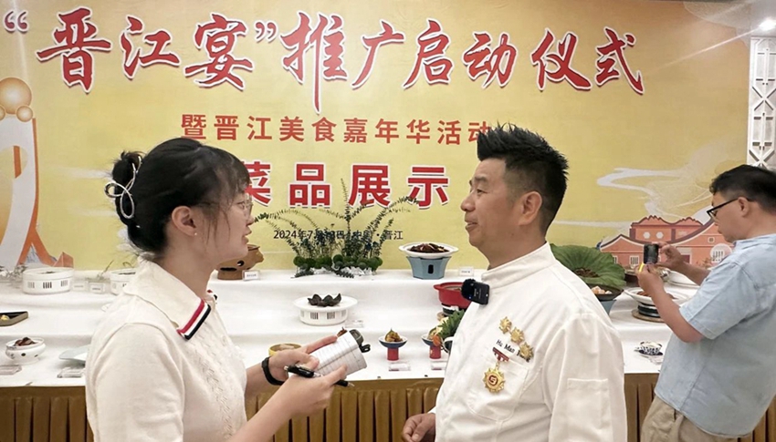 晋江餐饮烹饪行业协会会长胡满荣向记者详细介绍“晋江宴”。