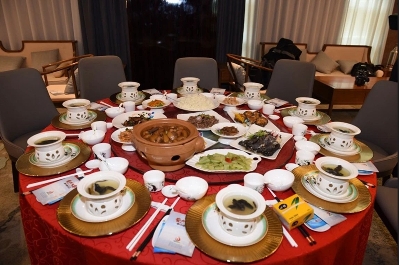 过水捞熟的面线和少量德化农家酿造的红酒拌制而成的红菇拌面线,滑嫩爽口,补血养气,营养丰富,茶油坛香羊肉、茶油煎鲶鱼、芋头粉蒸肉……在现场,德化本土厨师团队当场烹饪,所用食材也都从德化当地精选后运输进京。经过厨师一番切炒颠烹,厨师们将美食巧妙地点缀在精美的德化白瓷器皿上,形成了视觉和味觉俱佳的“瓷都盛宴”。现场参观者络绎不绝,精彩纷呈,参与品鉴活动的客人对德化美食赞叹不已。