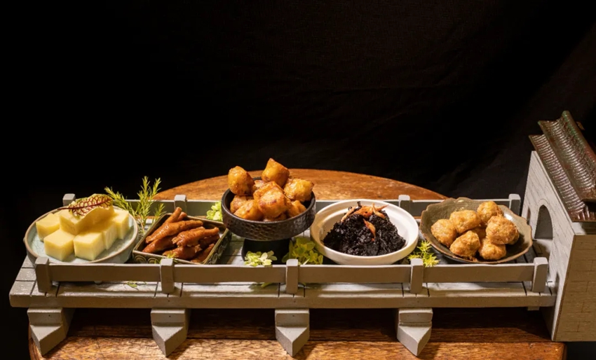 大肠、套肠、鸡蛋、米料、蛋肠、豆腐、牛肉、三层肉、牛筋、牛肚、肺胘等食材通过焖卤,香浓四溢。本道菜源自南安街头卤担演变,新增丰富卤制食材,是较有代表性的闽南古早味,丰盛的食材好比南安悠久深厚的文化底蕴,堪称“海滨邹鲁”,涵盖了“山海”,蕴含着中华文明中“金木水火土,仁义礼智信”的深厚理念,耐人寻味,引人赞叹。