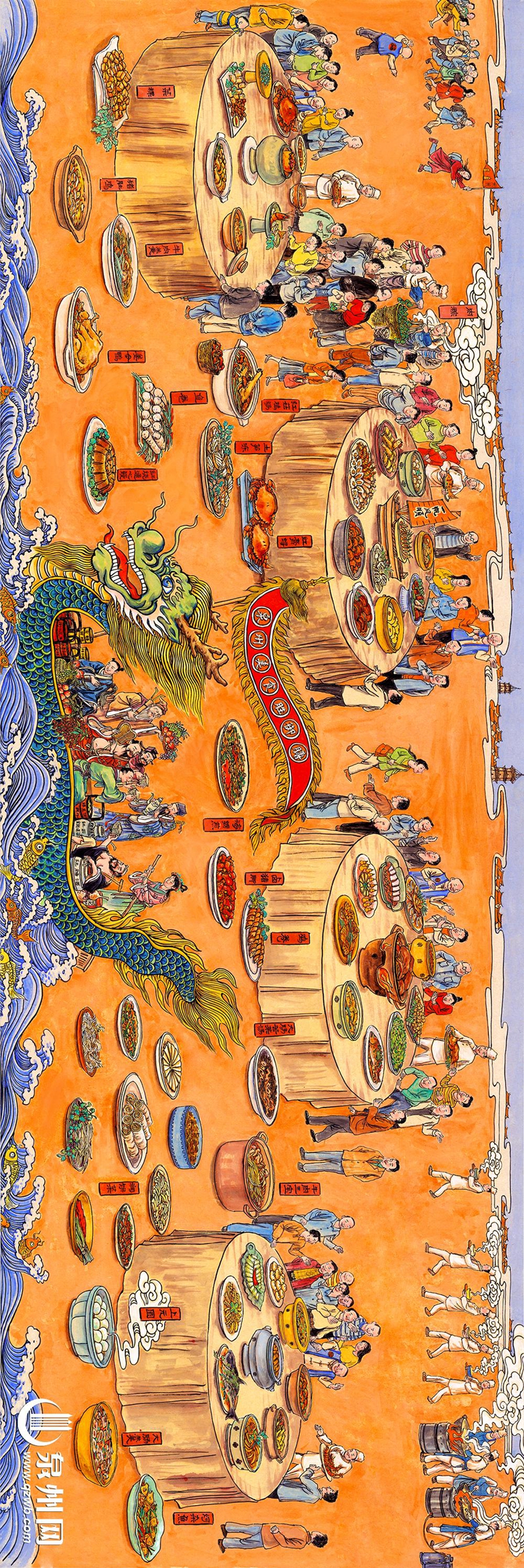 "This artwork is tailor-made for Quanzhou's bid to become a 'City of Gastronomy.' In terms of artistic technique, I've combined the traditional Chinese long scroll style with vibrant color painting, creating a visual language that reflects Quanzhou's innovative food culture, drawing inspiration from the past while embracing the present," Hong Zhixiong explained. "Within the piece, I've included five 'Afu' (Fortune) figures, symbolizing 'blessings coming to the door,' a traditional auspicious motif. Additionally, the Eight Immortals are depicted rushing to Quanzhou's gastronomic scene aboard a dragon boat, symbolizing the theme of 'Eight Immortals crossing the sea, eager to savor the fragrant offerings of ancient Quanzhou.'"