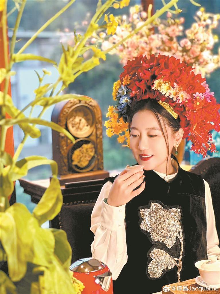 Tan Jing enjoying Tieguanyin tea with traditional floral hair accessories.