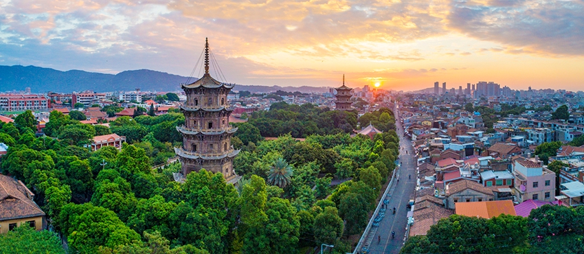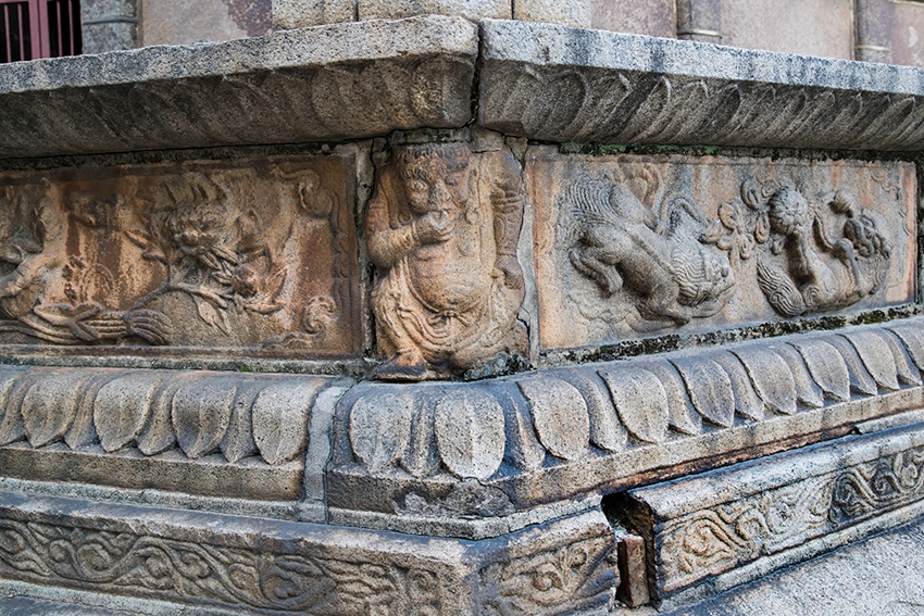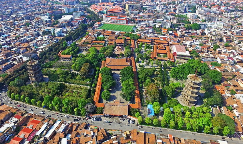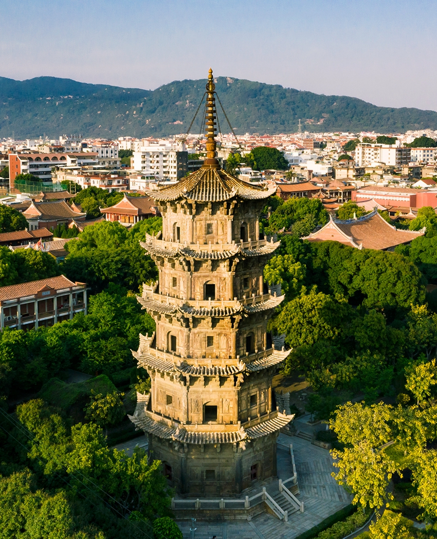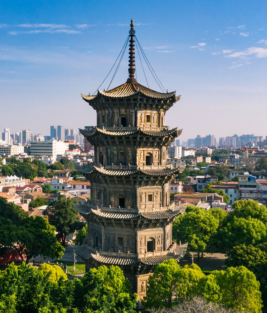 Kaiyuan Temple is a representative component reflecting the Multi-cultural Communities of Quanzhou as the world maritime trade emporium. As a result of maritime trade, its economic and diverse cultural relics reflect the economic prosperity and the fusion of diverse cultures of Quanzhou in the Song and Yuan eras. It also testifies to the significant contributions of rulers of the regional regime, Song and Yuan government officials, monks and powerful local clans to the city's socio-economic development and maritime trade in the Song and Yuan periods. Kaiyuan Temple sits outside of the west gate of the smaller city of Quanzhou, bounded by the east-to-west thoroughfare on the south. Covering an area of about 70,000 square meters, it is the largest extant Buddhist temple complex in Fujian Province. Founded in 686, the temple was expanded in the subsequent dynasties and reached its peak in the 10th century. Its main layout was formed in the 13th century. Currently, the temple faces southward and comprises the central building complex, the east and west stone pagodas, and the eastern and western ancillary groups of buildings. The palatial-style Main Hall with nine-by-nine bays is dedicated to enshrining the Five Dhyani Buddhas. The supporting brackets inside the hall, carved in the shape of 24 flying Apsaras resembling Kalavinka, were ingeniously integrated into the building structure. The Sumeru pedestal facade on the front platform inlaid with Hindu Kamadenu and lion relief figures. The two pillars in the very rear central bay of the Main Hall are Hindu pillars carved out of diabase. The Ganlu Precept Altar featuring a double-eave octagonal pointed roof, is one of China's top three surviving precept altars. A five-level ordination altar of its interior was established, surrounded by some other Apsaras functioning as supporting brackets. The East Pagoda (Zhenguo Pagoda), 48 meters in height, and the West Pagoda (Renshou Pagoda), 45 meters in height, are both five-storey octagonal pavilion-style granite pagodas. Each pagoda body consists of a central core encompassed with stone walls. On each floor there are four arched doors and four recessed niches, and various reliefs of Buddhist imagery are engraved on both sides of each niche and door. There are 80 such reliefs on each pagoda. Each theme blends perfectly into the carvings. All this testifies to the flourishing diverse religions and arts in Song-Yuan Quanzhou thanks to ethnic fusion and the inclusive cultural ethos.