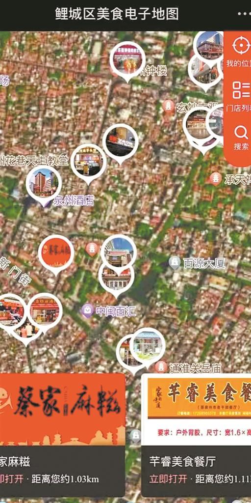 The new version of the Food Map boasts a cleaner, more user-friendly layout compared to its previous iteration. Gone are the cluttered, hard-to-navigate designs—now, users will find street names, landmark buildings, and major attractions clearly marked, making navigation effortless. The map currently lists nearly 100 dining establishments, offering a variety of iconic local dishes, such as Yuanfang Xiaolongbao (soup dumplings), Cai's Mazi (a type of deep-fried snack), and Sidan Ginger Duck (a traditional duck dish with ginger). Whether you’re looking for traditional Quanzhou delicacies or street snacks, the map serves as a comprehensive guide to the city’s vibrant food scene.