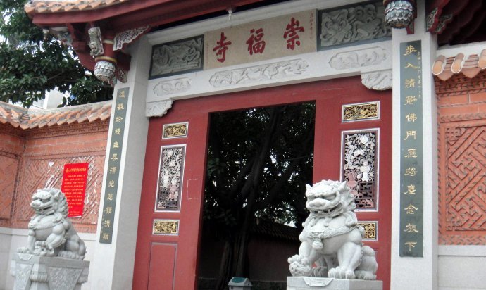 建寺于宋初,元祐六年(1091年)改名崇福,与开元寺、承天寺并称为泉州佛教“三大丛林”,是泉州少林寺废后传授少林武功的又一寺院。寺内有三殿堂,前为弥勒殿,中为大雄宝殿,后殿供奉雕塑精美的千手观音;其规制风格独特,殿堂巍峨宏敞,在古代木结构建筑中可称精致罕见。寺内仍存“镇山三宝”,为泉州最早石塔“应庚塔”、 能供千人饭食的“千人鼎”和铸于明初、声音宏亮的大洪钟;还有两尊刻工精细传神的宋代石雕像,为泉州宋代佛教小型石雕珍品,表明了崇福寺曾是南禅宗寺院。