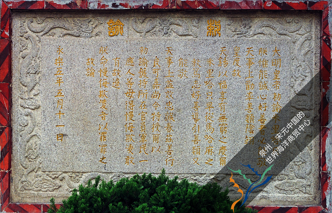 【敕谕碑】是1407年(明永乐五年)明成祖朱棣颁发保护伊斯兰教寺院的文告。碑文中记载“今特授尔以敕谕护持,所在官员军民一应人等,毋得慢侮欺凌,敢有故违朕命慢侮欺凌者,以罪罪之”,要求各地官员、军民不得怠慢欺凌穆斯林,违者治罪。
