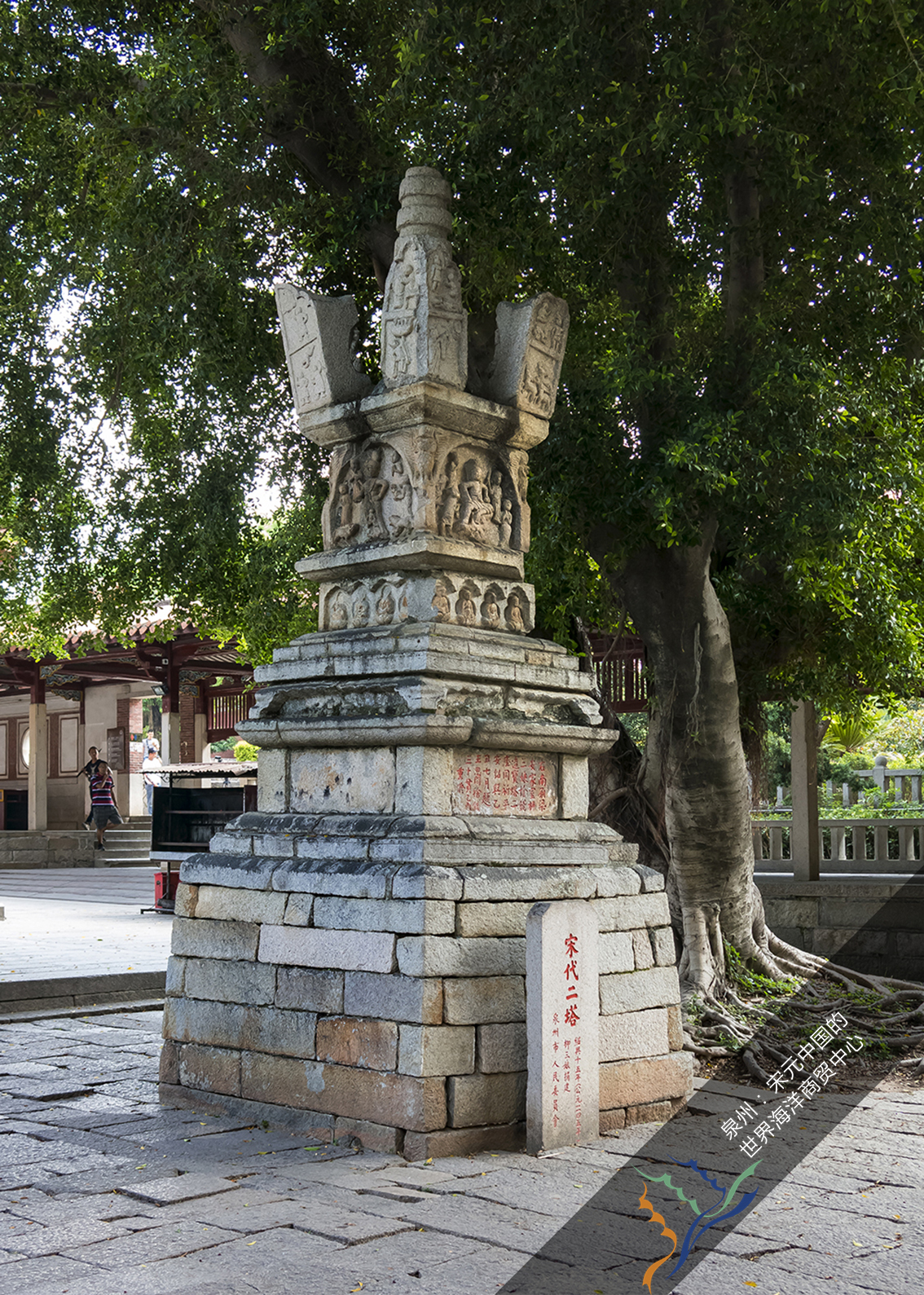 【拜庭】拜庭连接着天王殿和大雄宝殿,是可供僧侣、信众聚集的场地,面积2800平方米,两翼有长廊回护。两旁列置的陀罗尼经幢、窣堵波式塔、宝箧印经塔,都是8-10世纪随着汉传密教的发展而在中国新产生的佛教建筑形式。在11-14世纪期间,这些新生的佛教建筑在中国东南沿海大量建造和持续发展,并传播到东亚其他地区。现在我们看到的这些经幢、佛塔遗存,建造年代多为10-14世纪,一方面是东亚地区佛教建筑发展史中珍贵的年代标本,另一方面也有力地见证了泉州作为中国当时最重要的官方国际港口,多元文化在此地汇聚、融合和发展,留下了丰富的成果。