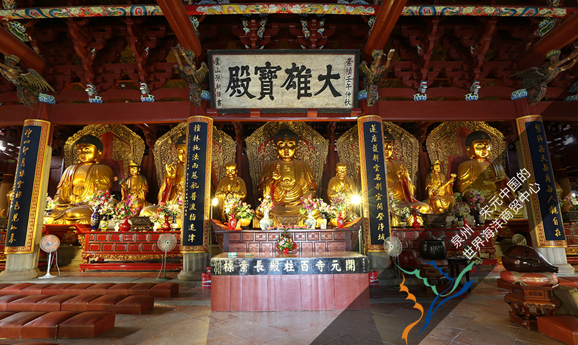 【大雄宝殿】大雄宝殿是开元寺中轴线上的主体建筑,面阔九开间,属于中国古建筑里最高的形制,大殿面积1388平方米。它始建于686年(唐垂拱二年),1637年(明代崇祯十年)重修为现状形制。