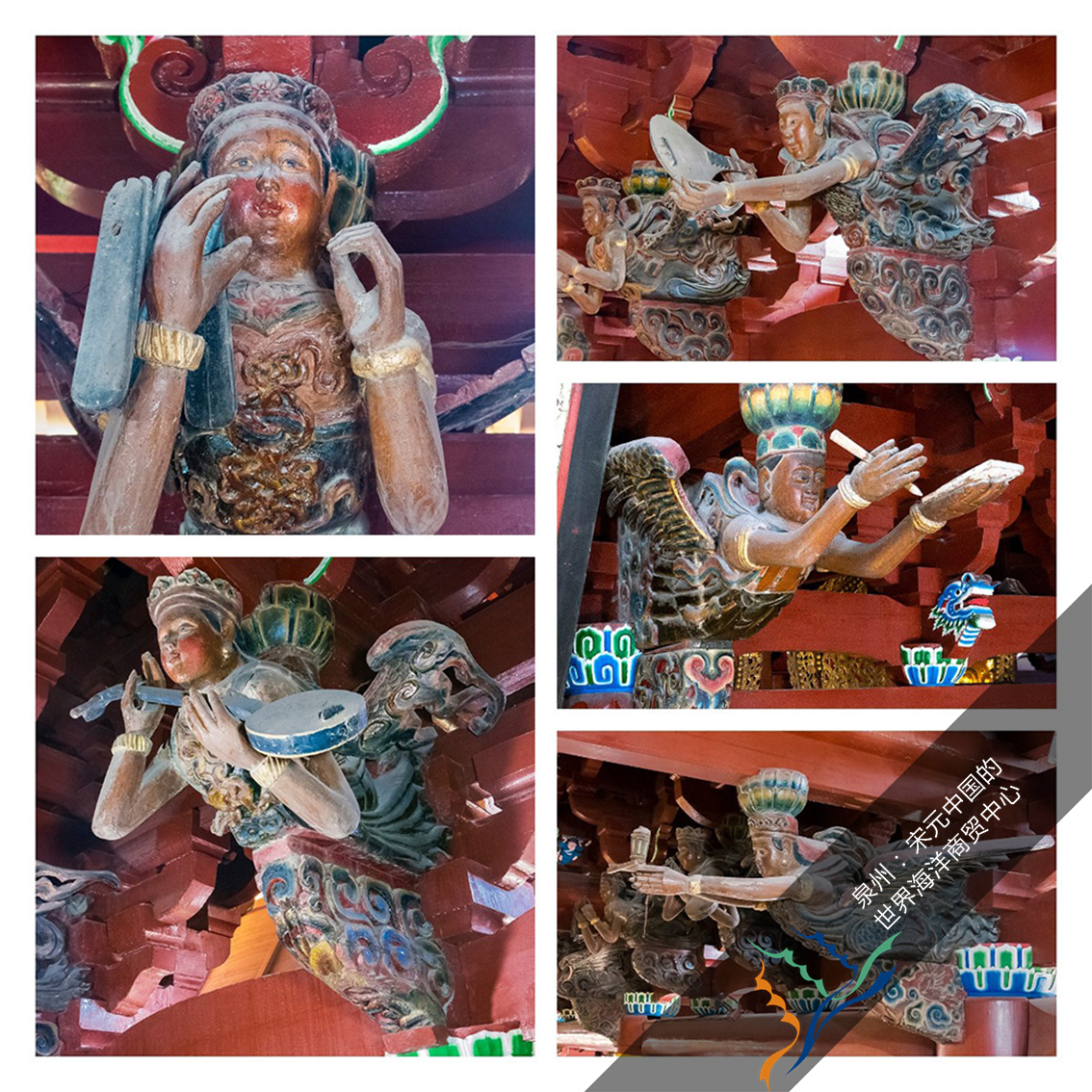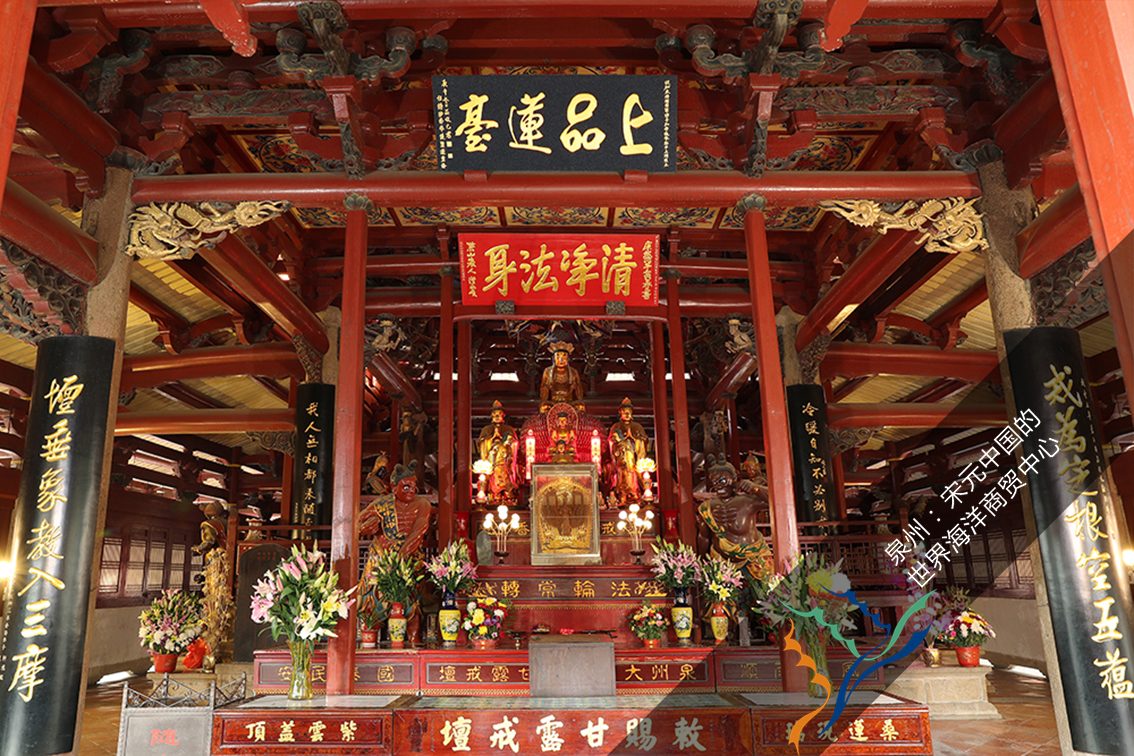 大殿中最令人赞叹的就是中部两排石柱和梁架接合处的斗栱,雕刻成二十四尊飞天乐伎,其造型源自佛经所述的神鸟“迦陵频伽”(妙音鸟),形象为人身羽翅鸟腿,这些飞天手中或执管弦丝竹乐器,或捧文房四宝,既承担支撑梁架的结构作用,又具有极高的艺术价值,为中国木构建筑所罕见。迦陵频伽的形象在7世纪就出现于中国北方及中原地区的佛教石窟寺壁画及雕塑中,一般均体现为佛前乐舞,值得注意的是,其在大殿中使用的位置也承袭了佛前乐舞的佛经描述场景,是非常具有想象力的创造。迦陵频伽斗拱的创造性特征,充分体现出10-14世纪的泉州,因来自中原及海外的多元文化汇聚融合作用,形成的开放、包容精神,以及社会文化的繁荣与活力。
