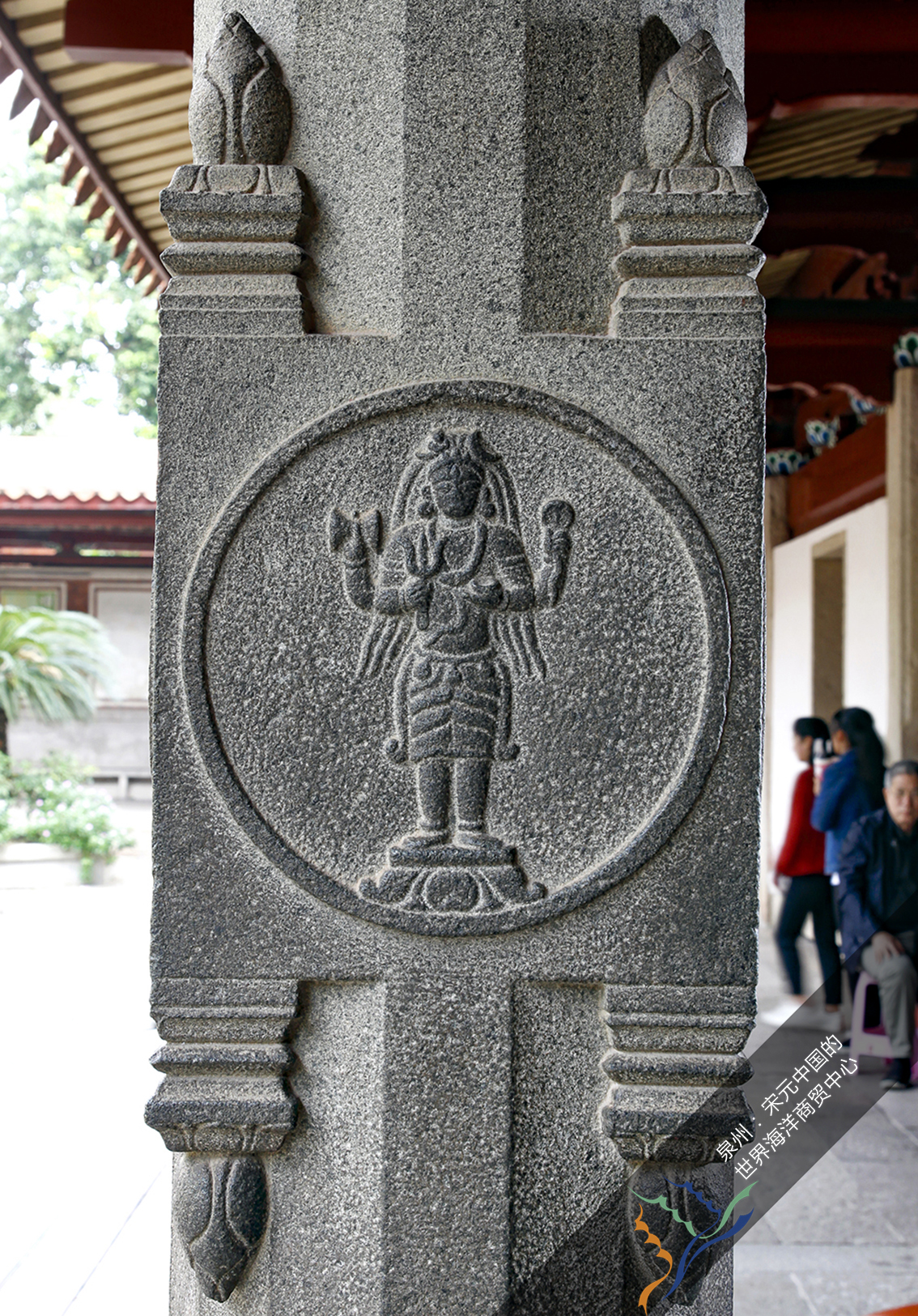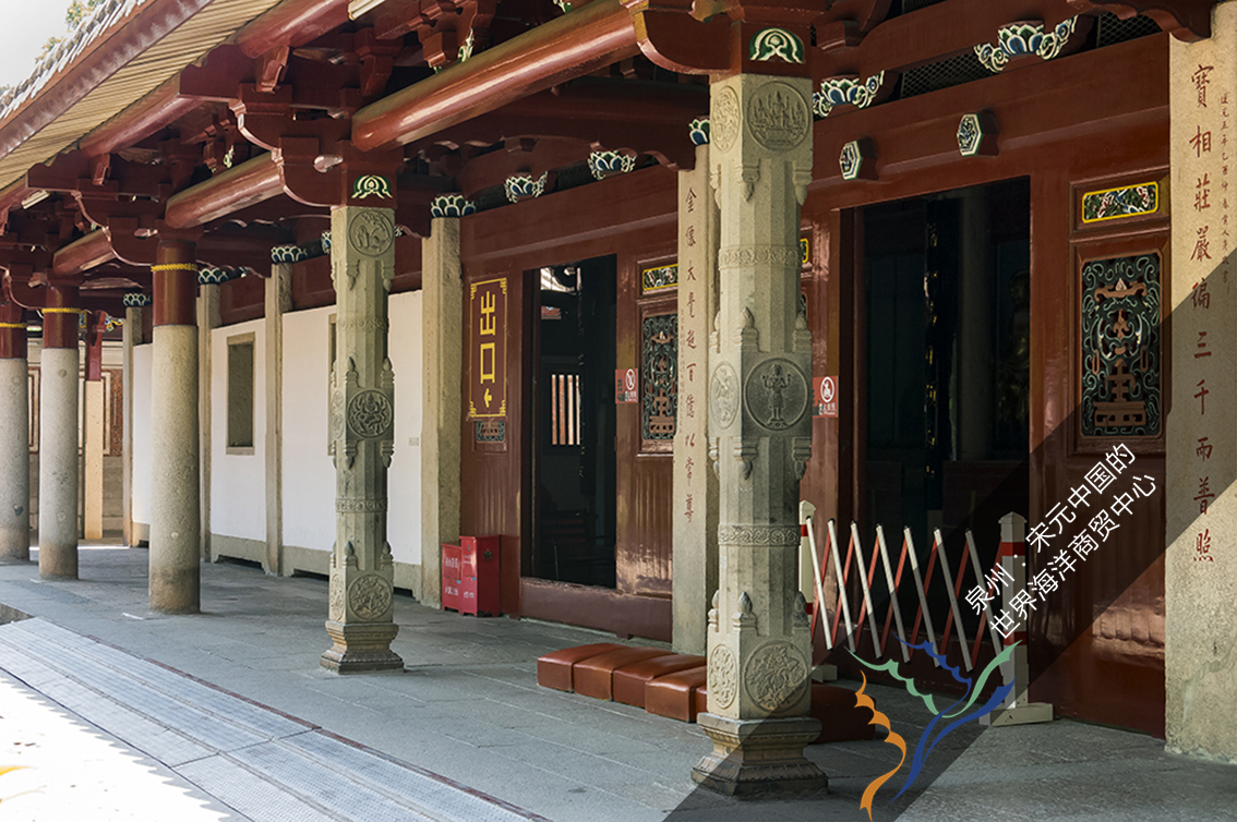 【山门】山门是开元寺的入口,始建于公元687年(唐垂拱三年),单檐硬山顶,面阔五间,进深三间,历代都有修缮,现状整体为18-19世纪(清代)传统建筑风格。根据研究,其中间三个开间的部分构件承袭了7-13世纪的建筑特征,如:石柱粗壮且呈梭状,承袭唐代风格。这种覆盆状的柱础具有宋代特征。石柱上悬挂的对联“此地古称佛国,满街都是圣人”,是我国南宋大理学家朱熹(1130-1200年)所撰,记载了当时泉州佛教的兴盛和僧侣众多的景象,弘一法师于1928-1942年住锡泉州时重新题写了对联。殿堂两旁的塑像是佛教密宗经典中的密迹金刚与梵王。