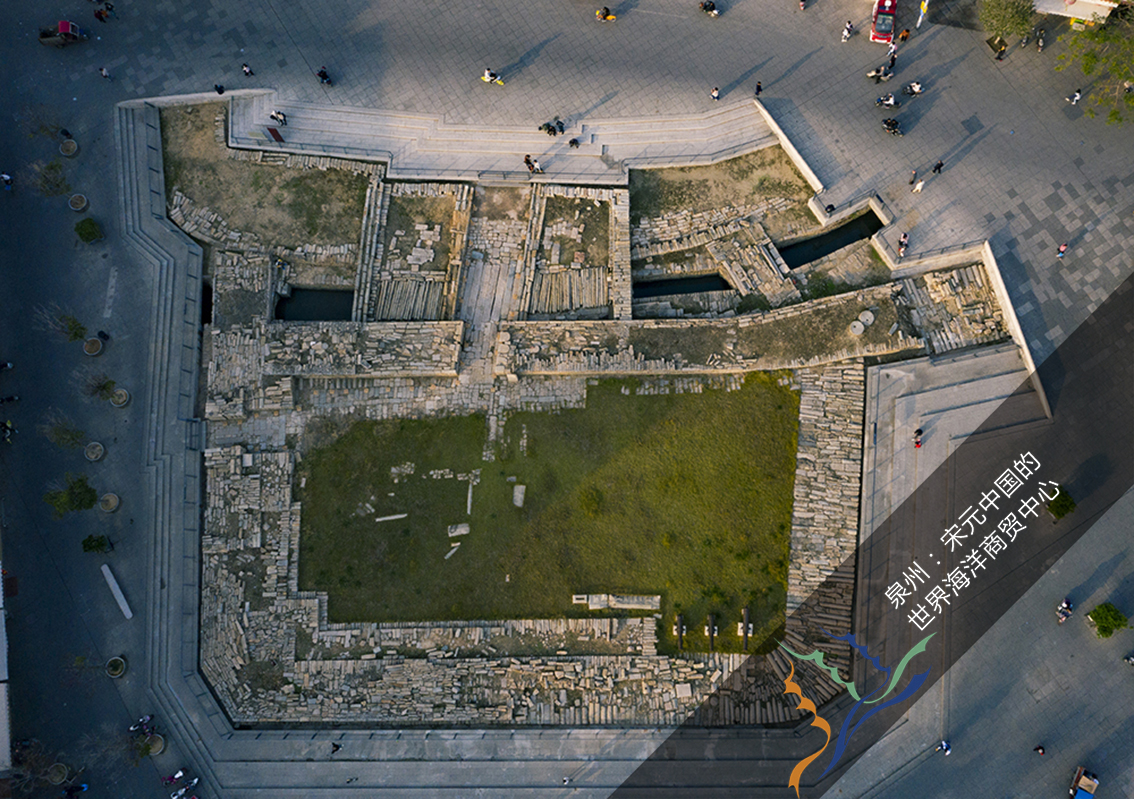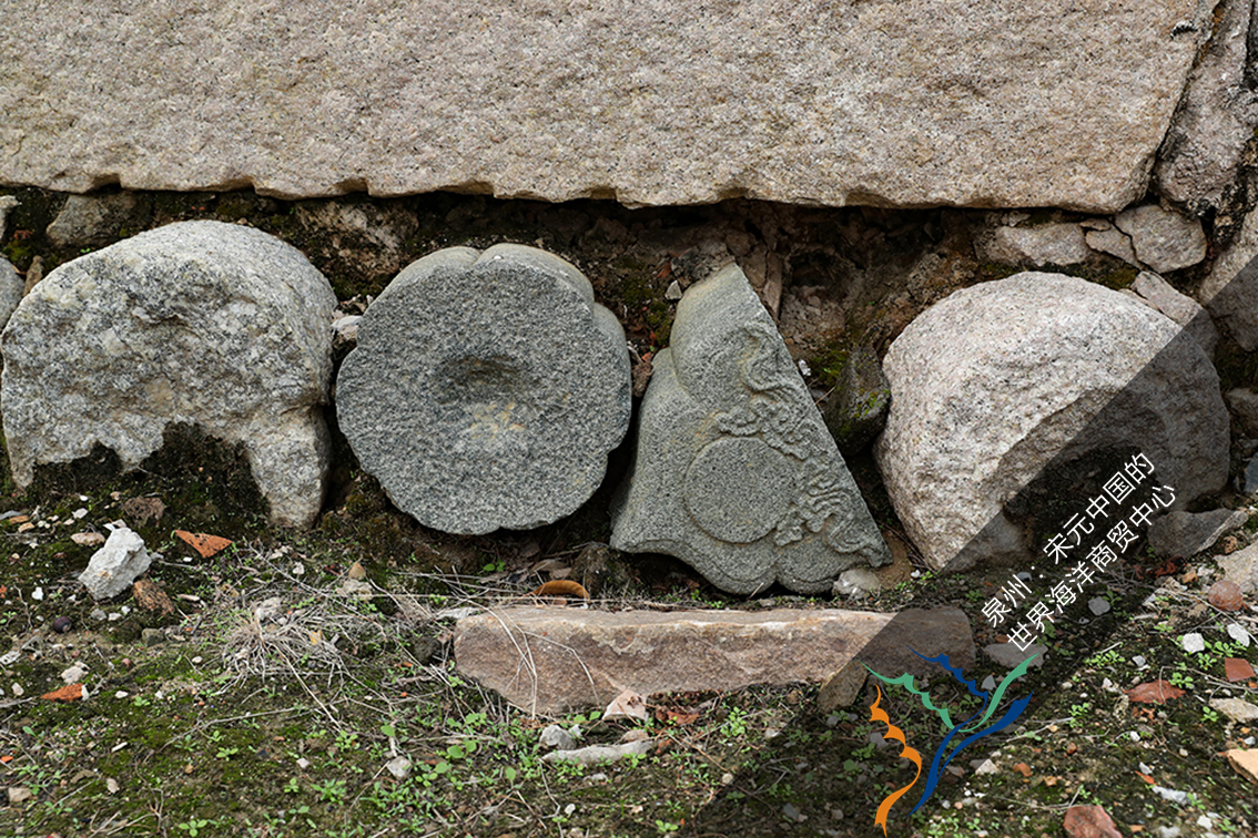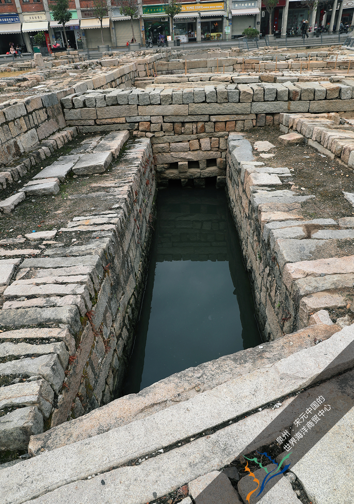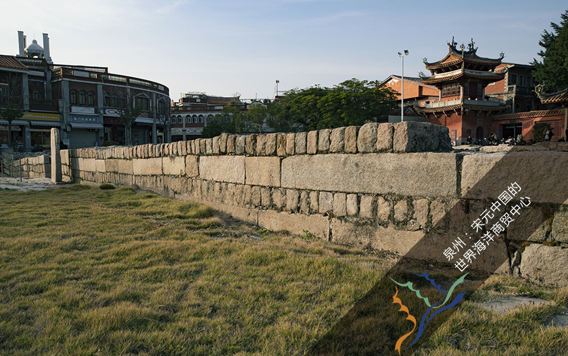 【宋代城墙遗址】建于南宋绍定三年(1230年),沿宋代晋江岸线成弧状东西向延伸。考古发掘揭露长度31.5米,墙宽7.2-7.6米,墙体外壁用条石丁顺分层筑砌,墙心填土及少量碎石并稍加夯筑而成。