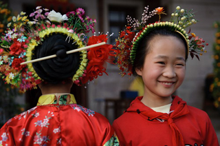 我国的发式、发饰与服饰已有数千年的历史,“蟳埔女”头饰文化的形成,经历了东晋以来的孕育期,宋元时期的转型期,清未民初的成熟期,以及新中国成立至现在的兴衰更迭的曲折发展期,但不管怎样,都能因特定的劳动形式和生活环境,由母教女,婆传媳,世代相传。对于蟳埔女的服饰渊源,有多种说法。有人认为,“簪花围”是宋元时期遗留下来的阿拉伯人风俗;还有人指出,蟳埔女的风俗是原始人类的遗传。俗称“簪花围” 的“蟳埔女”头饰各种鲜花则随季节而变化,花团锦蔟,美丽芬芳,既反映“海上丝绸之路与蟳埔民俗文化”的因缘关系,也是民俗文化的研究范畴。