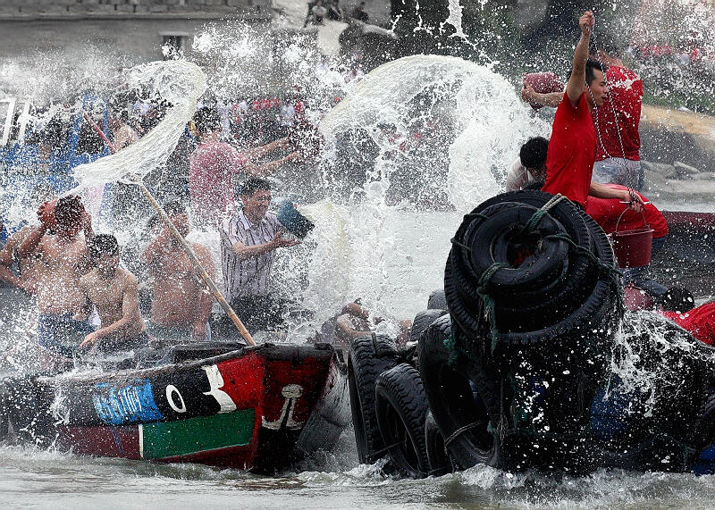 石狮蚶江端午闽台对渡习俗历史源于明清,当时“蚶江为泉州总口,与台湾鹿仔港对渡。大小商渔,往来利涉,其视鹿仔港,直户庭耳。利之所在,群趋若鹜”(见“对渡碑”)。蚶江成为大陆与台湾通航通商的中心码头,郊商百余家,对渡船只300余艘,海交贸易繁荣兴盛。为此,时人每逢端午节,对渡船只相互追逐泼水,交融情谊,互祝吉祥。20世红六十年代至八十年代为中断期,九十年代至今为复兴期。自此,蚶江海上泼水越泼越旺,从原来的小舢舨发展到小机船,安全快速;由过去的男人专项活动,发展到年轻姑娘也上船参与,情趣倍增;由十几艘发展到上百艘,场面更壮观。端午节这一天,蚶江古渡沸腾了,成千上万的观众从四面八方涌向滨海,只见百舸在泉州湾海面上竞渡穿梭,人们用各种勺、桶盛满海水,相互追逐倾泼,男女浴情,热气火红。人们视此水为“吉祥水”、“幸福水”,让这圣水情雨淋个透,可消灾驱邪,以图吉祥、幸福、兴旺。同时,在这一天也举行庙会、采莲、祭江,护航仪式,捉鸭子、赛龙舟等活动内容,将闽台文化、传统文化、美食文化、旅游文化融入其中,内涵更丰富,使之更为魅力。