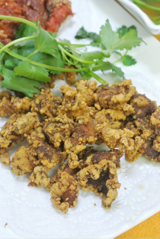 醋肉是一种以香醋等腌渍,再拌上淀粉经油炸的食品,外酥里嫩,还带着淡淡的醋香。醋肉,是闽泉州人家最常制作的家常菜之一,也是闽南最经典的肉的料理方式。尤其是用来招待外地友人,一定少不了一盘醋肉。因为口感好,又带点嚼劲,吃过之后令人意犹未尽,醋肉赢得各地食客的美誉,因此化身为泉州名小吃,远近闻名。醋肉的第一道程序是腌制。前期腌制所需要的配方更是尤为重要。顾名思义,一般人家都用酱油加醋来腌制,讲究一点的酒店或餐馆还有各自的一些所谓“秘方”。一般腌制一两个小时,然后加入适量地瓜粉,不加水,慢慢抓匀。接着将肉片依次放入七分热的油锅中煎炸,至表面微黄时捞出。然后再次将油锅烧至八成热,倒入头遍炸好的肉再炸至金黄即可。这道具有闽南特色的炸醋肉,无论是在五星级酒店还是街边的快餐饭店里都可以点到,它的食用方式也很百搭。干吃的话,可以直接蘸着甜辣酱、喼汁,或者芥末,用来下酒。煮汤的话,根据喜好添加青菜或其它任意配料,吃起来带点酸味,又有些嚼劲,也很经典。