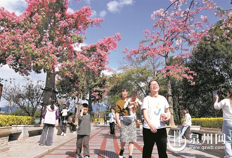 眼下,小雪时节,气温开始走低。昨日,恰逢周末,泉州迎来了晴暖好天气,在西湖公园南大门处一路繁花,美丽绽放的异木棉与蓝天相映,美不胜收,让市民游客沉浸在色彩斑斓的花海之中。(王柏峰/摄)