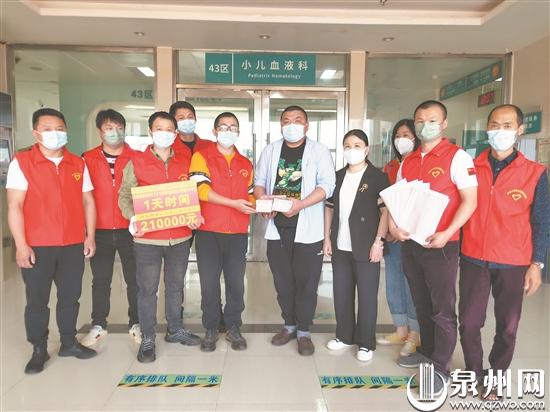 昨日上午,惠安县小马哥合众救助慈善公益协会8名志愿者来到福建医科大学附属协和医院,将沉甸甸的21万元善款,交到小毅(化名)父亲的手上。