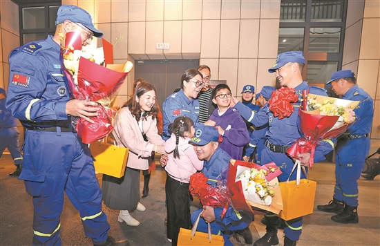 蓝天救援队队员抵达泉州晋江国际机场,受到家属和社会各界的热烈欢迎。