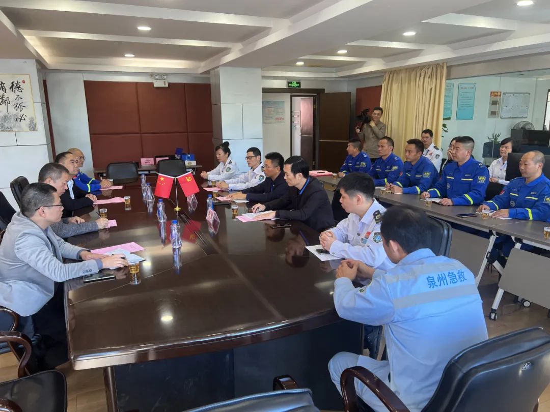 会上泉州市急救指挥中心洪建芳主任与泉州市蓝天应急救援中心苏国顺队长简要介绍各自队伍的建设情况。泉州市急救指挥中心负责全市突发事件紧急医疗救援、院前急救的指挥调度、中心城区急救抢救及院前急救业务指导与培训、急诊急救质量控制等任务,拥有一支专业医学救援队伍。蓝天救援队也是一支公益性应急救援组织,具有各类复杂环境下的救援能力,人员专业,设备齐全。“今年5号台风杜苏芮期间,在台风登陆后4个小时里,中心所接到的警情剧增。由于人员紧、任务重,倒伏的树木挡住急救车的去路,为了救人急救人员只能迎着风雨徒步前行,几经周折才将患者送往医院。”洪建芳表示,在对此次抗击台风工作进行复盘时,团队发现在医护团队驱车救治病人途中,如果有专业的救援力量参与其中,势必事半功倍,将极大提高急救效率。为此,在泉州市委文明办及市卫健委的积极协调下,最终促成了双方协同急救机制的建立。签约后,双方将在自然灾害、突发重大事件等各类环境下开展联合救援,提高院前急救综合救援能力,努力实现反应快捷、覆盖全面、安全高效的院前救援服务目标。